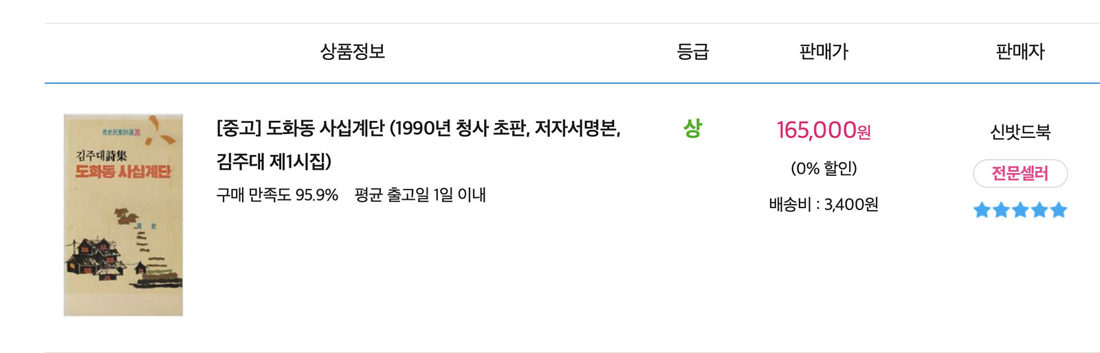 온라인 중고 서점에서만 살펴보던 검색을 구글로 옮겨 폭넓게 검색해봤다. 쿠팡에 반품들어온 책이 있다며 10800원에 판다고 되어 있었다. 딱 1권이 남았다고 했다. 횡재만난 기분으로 구입했다. 흥미가 생겨 김주대의 시집을 검색해 봤다. 1990년에 나온 『도화동 사십계단』이 온라인 중고서점에 16만5천원에 나와 있었다. 설명에 사인본이라고 되어 있다. 누구에게 서명해서 줬는데 내놓은게 아닐까 싶었다. 알라딘의 온라인 중고서점을 들여다보고 있노라니 중고책이 중고가 아니다. 나올 때 그때그때 사두는 것이 돈을 아끼는 길이다. 오래된 시집들은 전자책으로 모두 내주었으면 좋겠다.