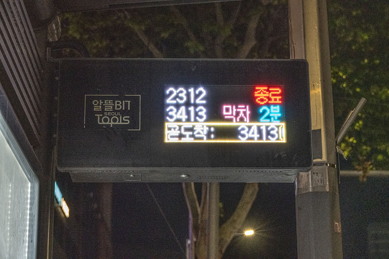 길동에서 내려 집으로 걸어갈 결심이었다. 하지만 밤 1시를 넘긴 그 시간의 정류장 전광판에 집의 코앞까지 가는 3413번 버스의 막차가 온다고 선명하게 찍혀 있었다. 반가운 마음에 정류장에서 일어나 시선을 멀리까지 보내 오는 막차를 마중했다.