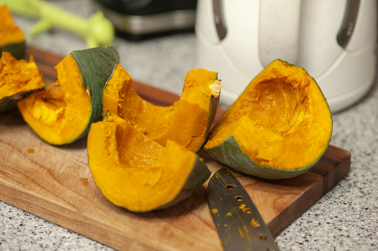 단호박 스프이니 단호박은 필수이다. 보통은 찜통에서 쪄먹던 것이다. 그러나 단호박 스프가 되는 길의 단호박은 스프가 되기 위해 5분 동안 전자레인지에 들어갔다 나와야 했다. 단호박의 몸이 따뜻하게 덥혀 졌다. 속은 말랑말랑해졌을 것이다.