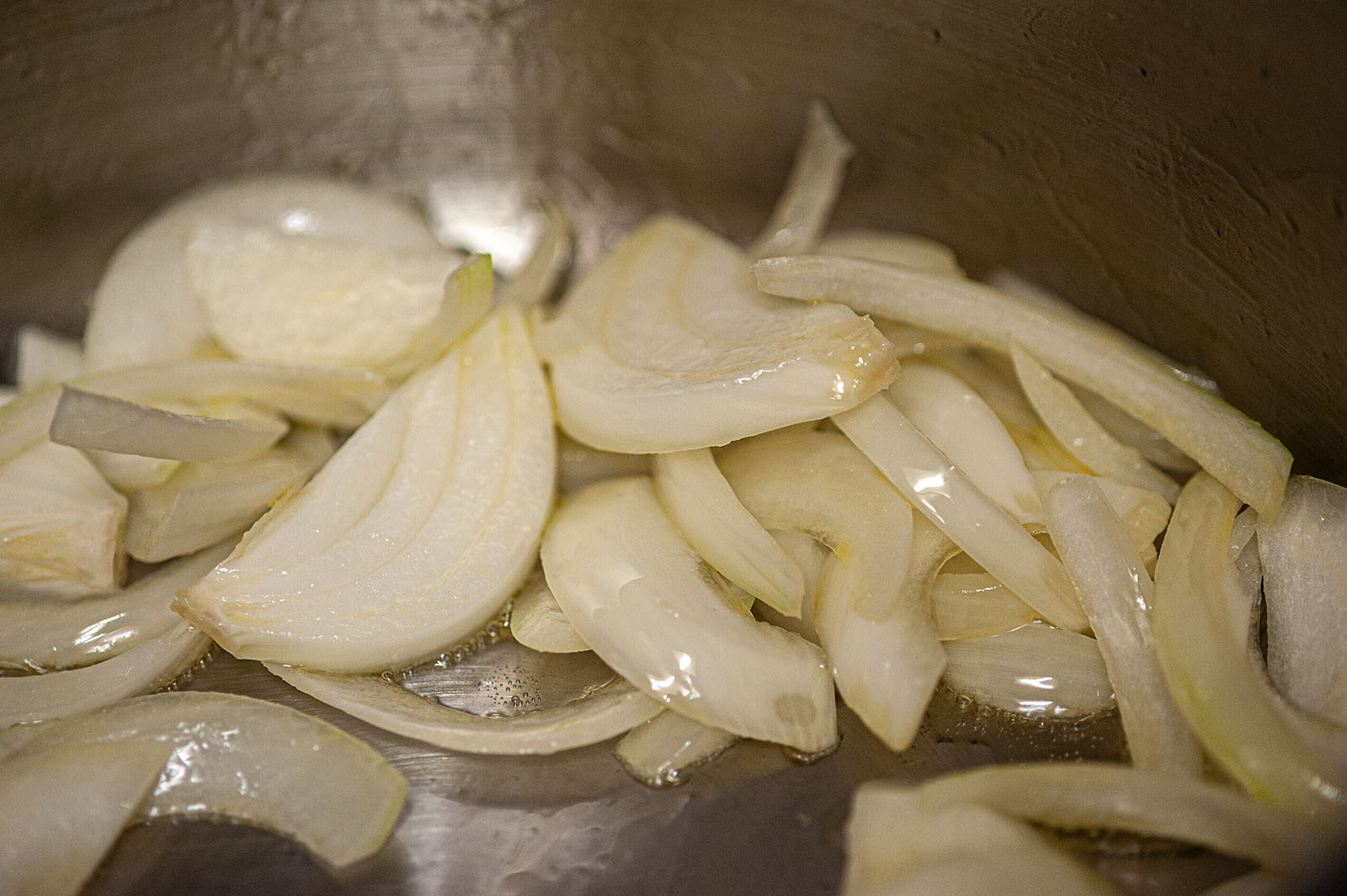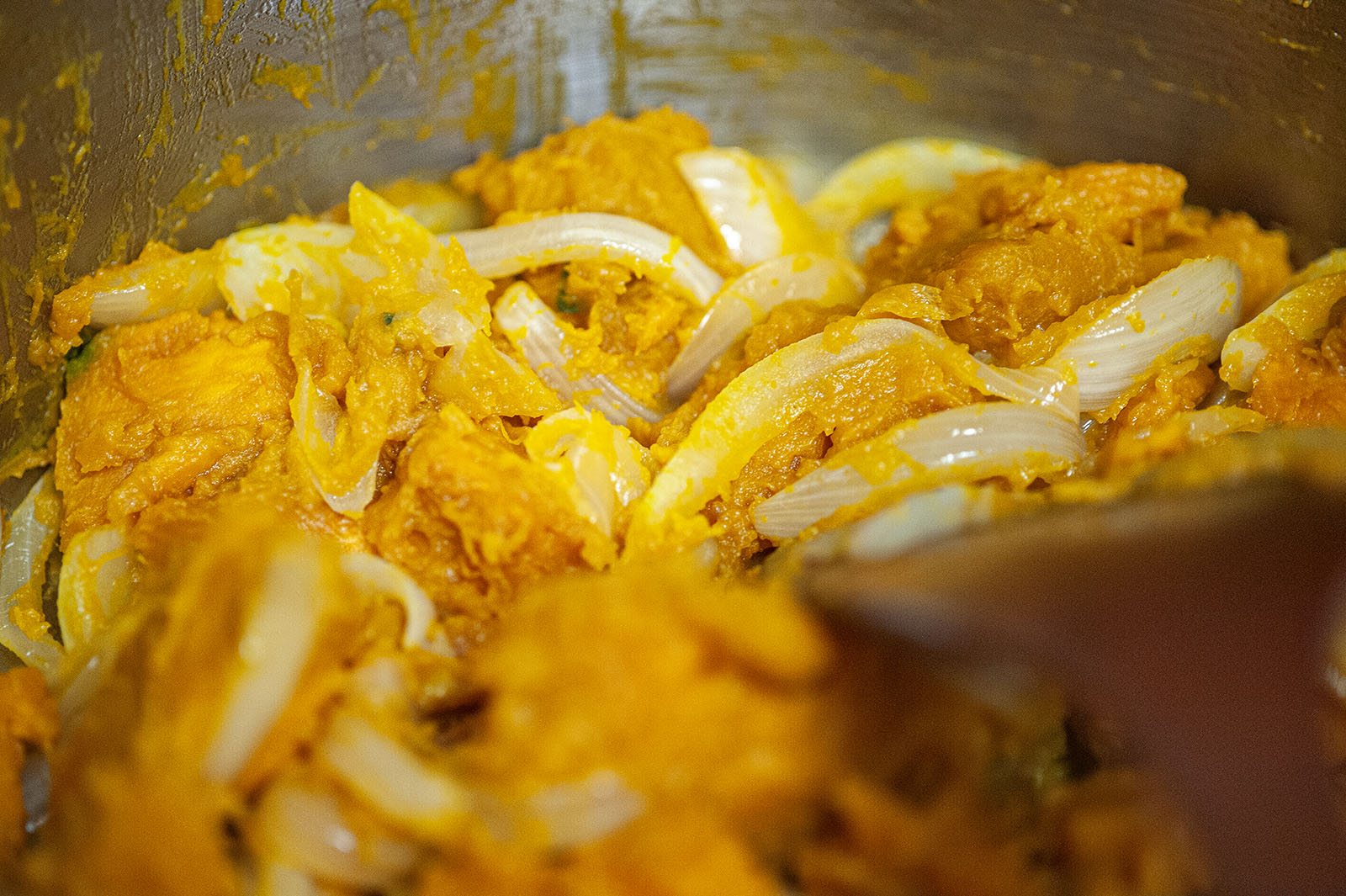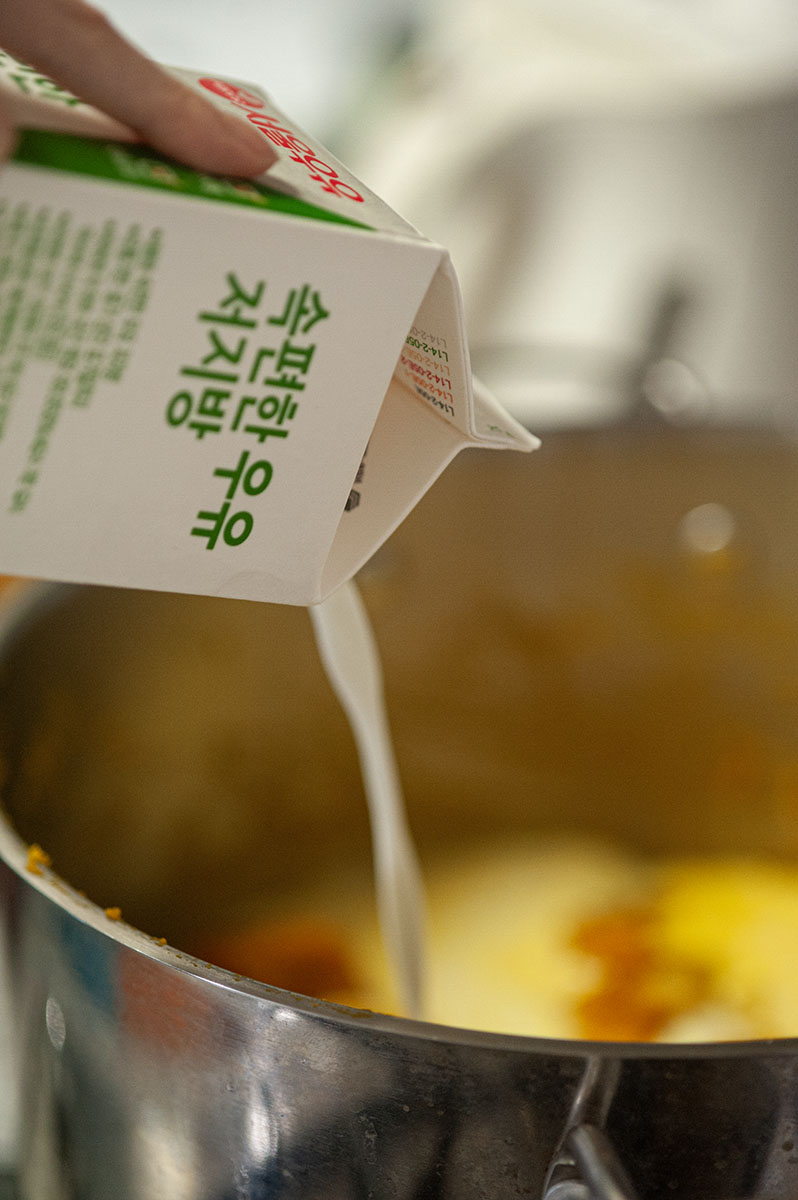 껍질을 벗겨낸 단호박의 속을 썰어넣고 미리 볶아놓은 양파과 함께 뒤섞어 다같이 볶기 시작한다. 아직 이것으로 끝이 아니다. 스프의 길은 조금 더 남았다.
