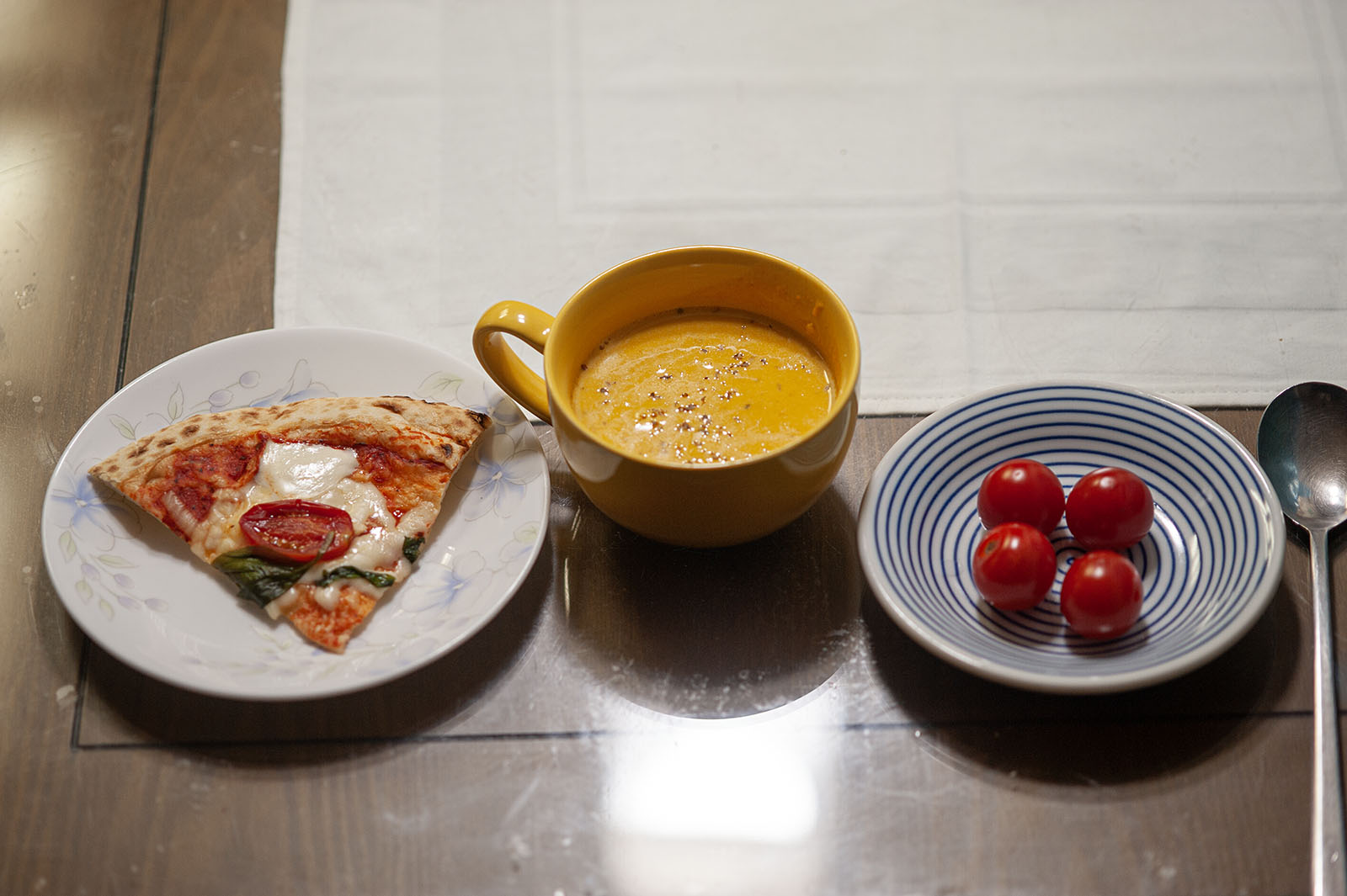 딸이 단호박 스프를 한 날, 나의 저녁은 피자 한 조각, 단호박 스프, 방울 토마토 네 개였다. 단호박 스프가 저녁의 중심이었다.