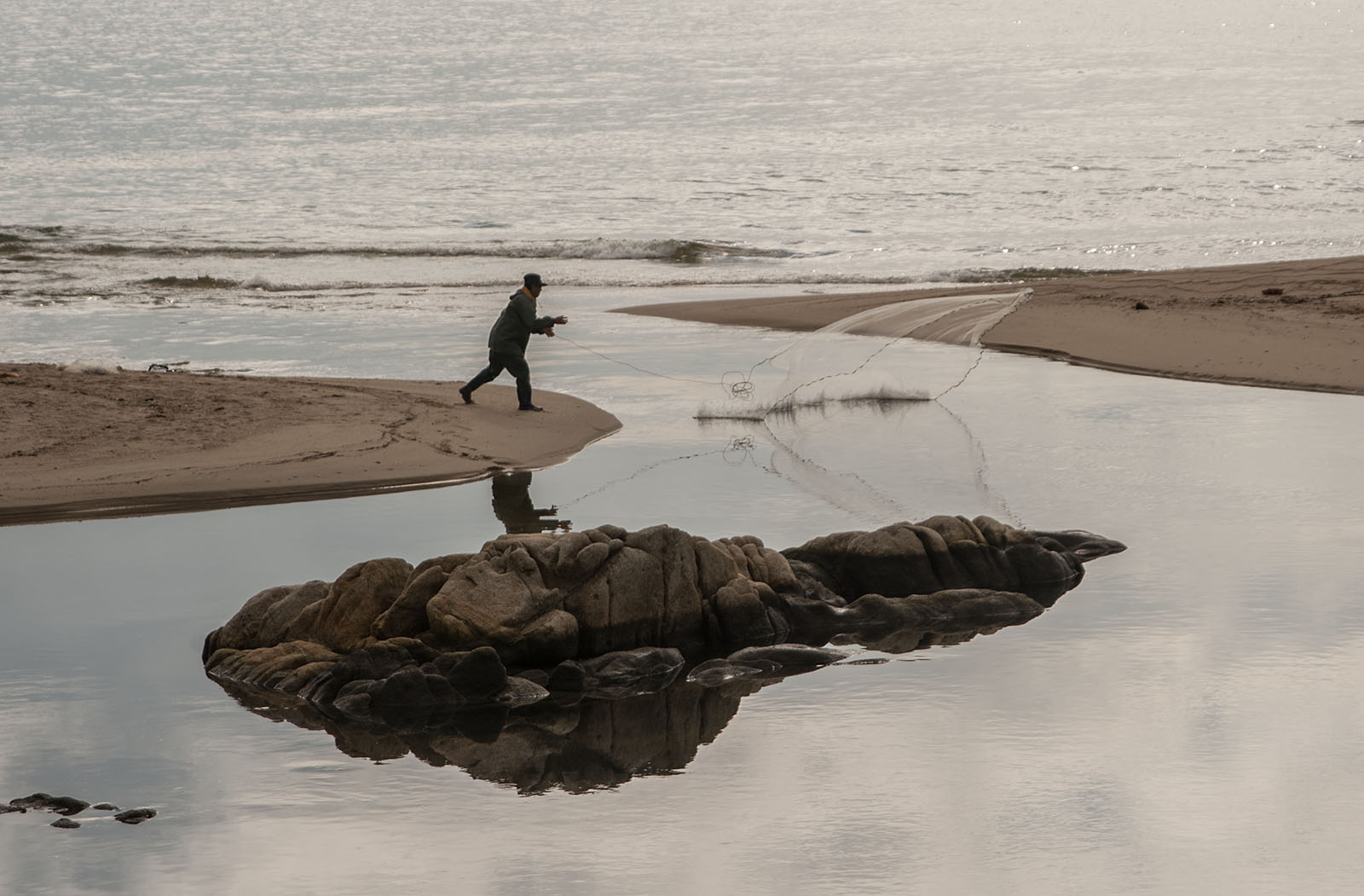 동해의 어부가 투망을 던진다. 연곡천과 동해 바다가 만나는 곳이다. 영진항의 한켠에서 뻗어나온 모래톱과 연곡해변을 달려온 모래톱이 그 사이를 비워 물길로 내주고 있었다. 바다와 천이 만나는 그 모래톱과 톱 사이에서 어부는 항쪽의 모래톱에 자리를 잡았다. 어부는 재두루미처럼 꼼짝않고 기다리다 마치 부리로 수면을 찍듯 투망을 던졌다. 바다에선 햇볕이 반짝거리며 물결을 타고 떼로 몰려다니는 날이었다. 잠시 민물을 엿본 바다의 햇볕이 그물에 잔뜩 걸려 올라오는 것은 아닐까 싶었다. 잔잔한 민물 속으로 구름도 내려와 있어 햇볕 대신 구름이 걸려 올라올 수도 있는 날이었다. 햇볕도 구름도 낚이지 않았다. 햇볕과 구름은 어디나 흔했지만 쉽게 낚이질 않았다. 그래도 어부는 만족스러웠다. 물고기가 햇볕처럼 반짝거리며 걸려들면 마음의 즐거움이 구름처럼 부풀어 올랐다. 물고기는 햇볕이고 또 구름이었다. 어부는 물고기를 건져내며 햇볕도 구름도 가져갔다.