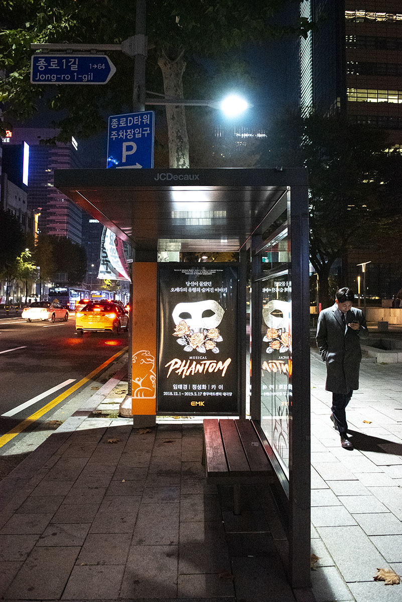버스 정류장 위 표지판은 이곳이 종로1가임을 알린다. 근처에는 광화문역과 종각역이 있다. 남자의 걸음은 광화문 방향이다.