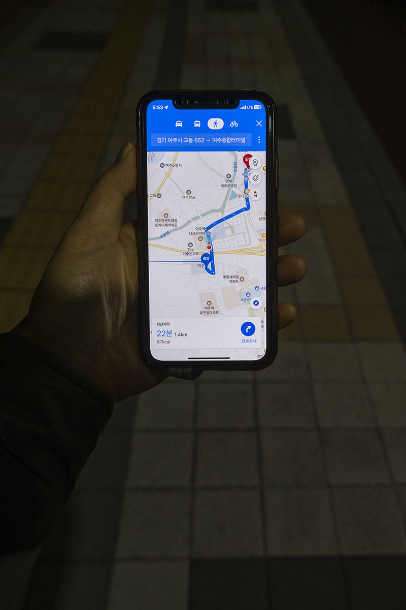 난 휴대폰을 꺼내 지도 앱을 켰다. 시외버스터미널이 어디쯤 있는지 지도에서 찾아보았다. 걸어서 25분쯤 걸린다고 나왔다. 그래서 지도 앱을 들고 걸어보기로 했다. 인적도 드물어서 물어볼 사람 찾기도 어려운 길을 걸었다. 누구에게도 길을 물어보지 않고 무사히 시외버스터미널에 도착했다.
