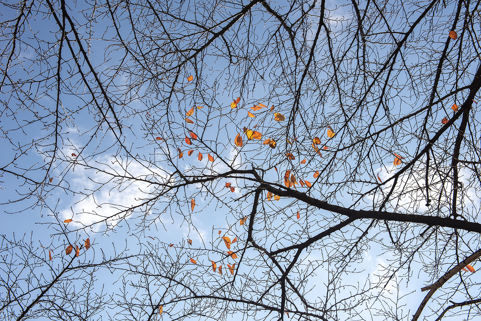 벚나무이다. 봄에는 가지 사이에 따뜻한 온기가 차고 그 온기에 가장 먼저 몸이 달아오르는 것은 꽃들이다. 온기에 몸을 부비며 꽃들이 피는 까닭이다. 겨울이 다가오면 온기가 가시고 냉기가 찬다. 쌀쌀한 냉기가 이제 겨울이 완연해 졌다 싶을 때쯤 남아있는 잎 몇 개를 가지 사이에 띄워 몸이 붉은 물고기 몇 마리가 푸른 하늘을 바다처럼 유영하게 한다. 열대의 물고기 몇 마리로 허공을 달구며 겨울의 초엽을 지나간다.