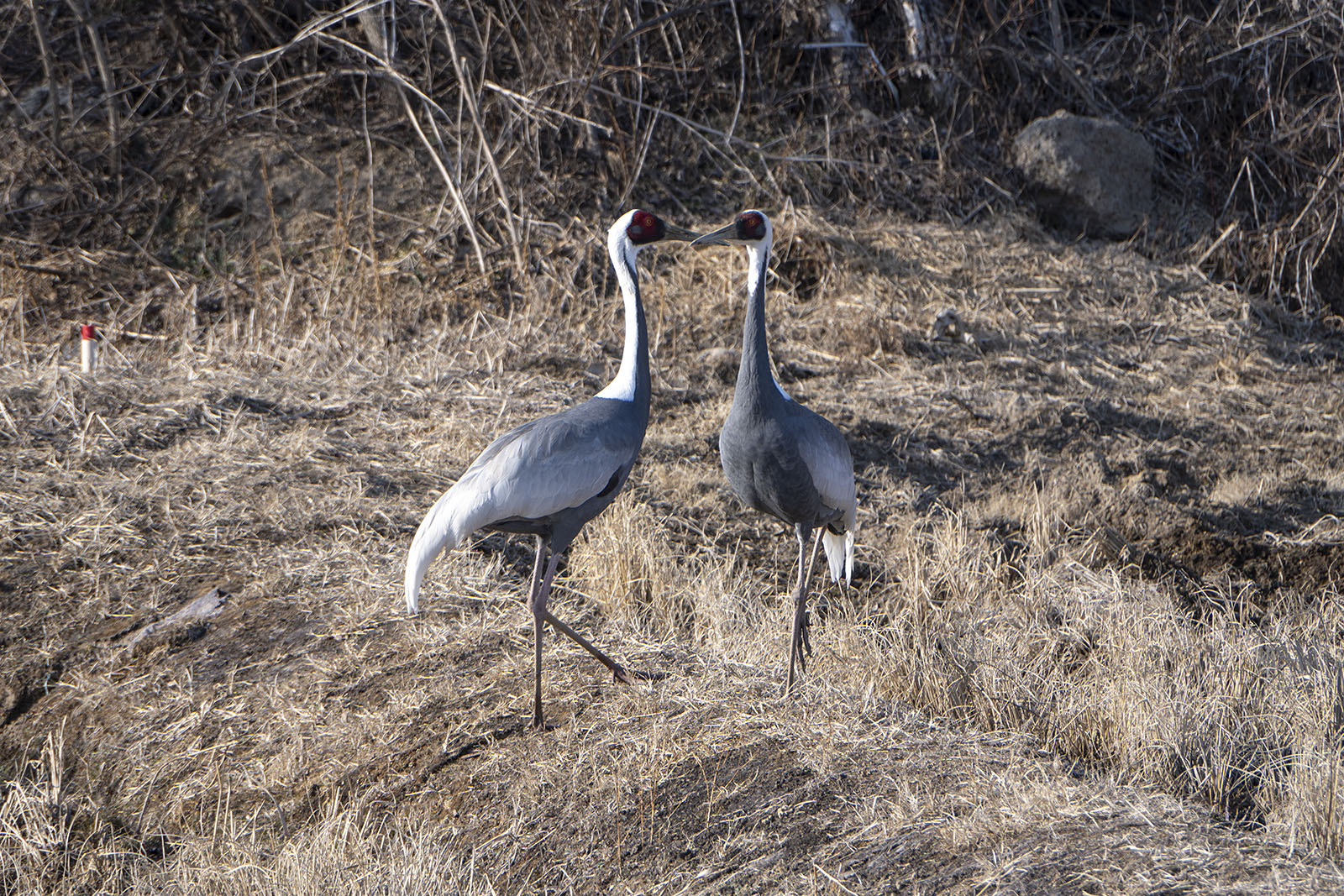 더더욱 좋았던 것은 두루미를 보는 데 그치지 않고 두루미의 사랑을 본 것이었다. 재두루미였다. 등이 회색이어서 재두루미지만 목덜미가 흰색이어서 영어 이름은 목덜미가 흰 학(white-naped crane)이다. 하지만 가장 눈에 띄는 특징은 붉은 눈이었다. 우리는 사랑할 때 입술을 나누는 데 재두루미는 부리를 나누었다.