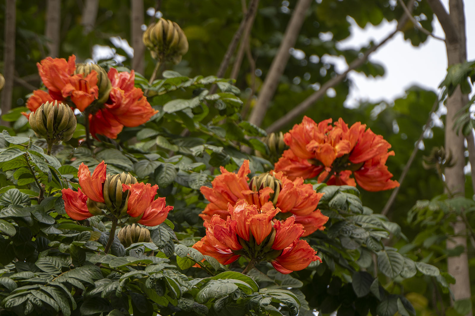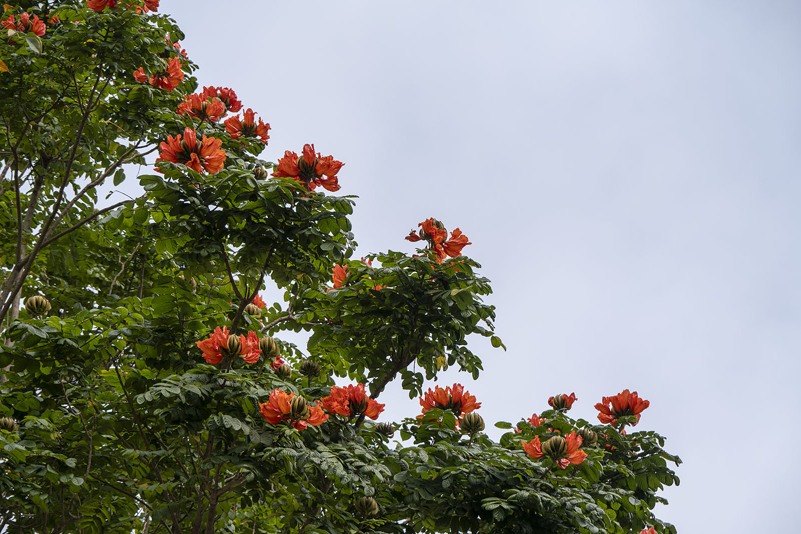 무성한 푸른 잎들 위로 붉은 꽃을 내민 나무가 있었다. 나무의 이름은 화염목(火焰木)이다. 불꽃의 나무인 셈이다. 그러니 꽃이 그냥 꽃이 아니라 불꽃이다. 타이베이에서 가로수로 서 있는 것을 자주 만났으며 공원에서도 많이 볼 수 있는 열대 관상수라고 한다. 아프리카 튤립 나무로도 불리며 붉은색이나 주황색 꽃이 횃불처럼 핀다고 한다. 내가 본 것은 붉은 색의 꽃이었다. 화염목은 사계절 내내 푸른 잎을 유지하며 8m 이상 곧게 자라는 큰 나무를 가리키는 상록 교목이다. 나무가 정말 컸다.
