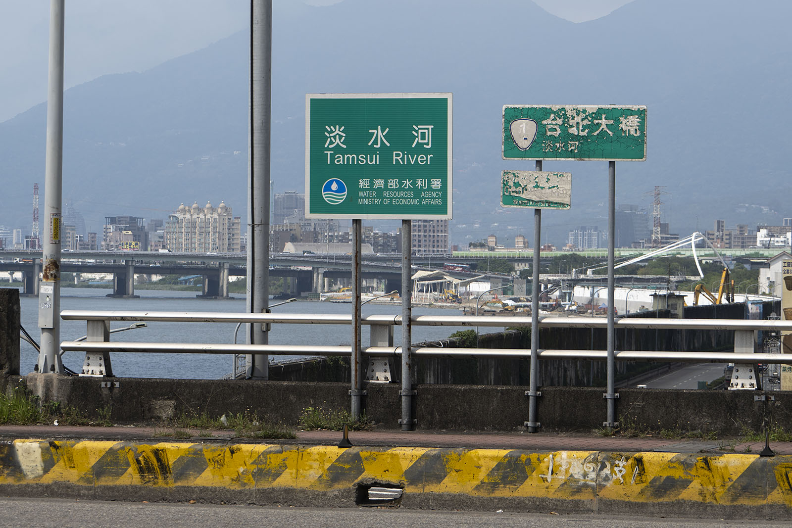 다리 위의 한켠에선 표지판이 이 강이 단수이강이며 한자로는 담수하(淡水河)로 적는다는 것을 알려준다. 구글은 그뜻이 맑은 물이라고 한다. 하지만 우리한테 담수는 맑은 물이라기 보다 소금기가 없는 물이다. 표지판은 다리 이름이 타이베이 대교라는 것도 함께 알려 주었다.