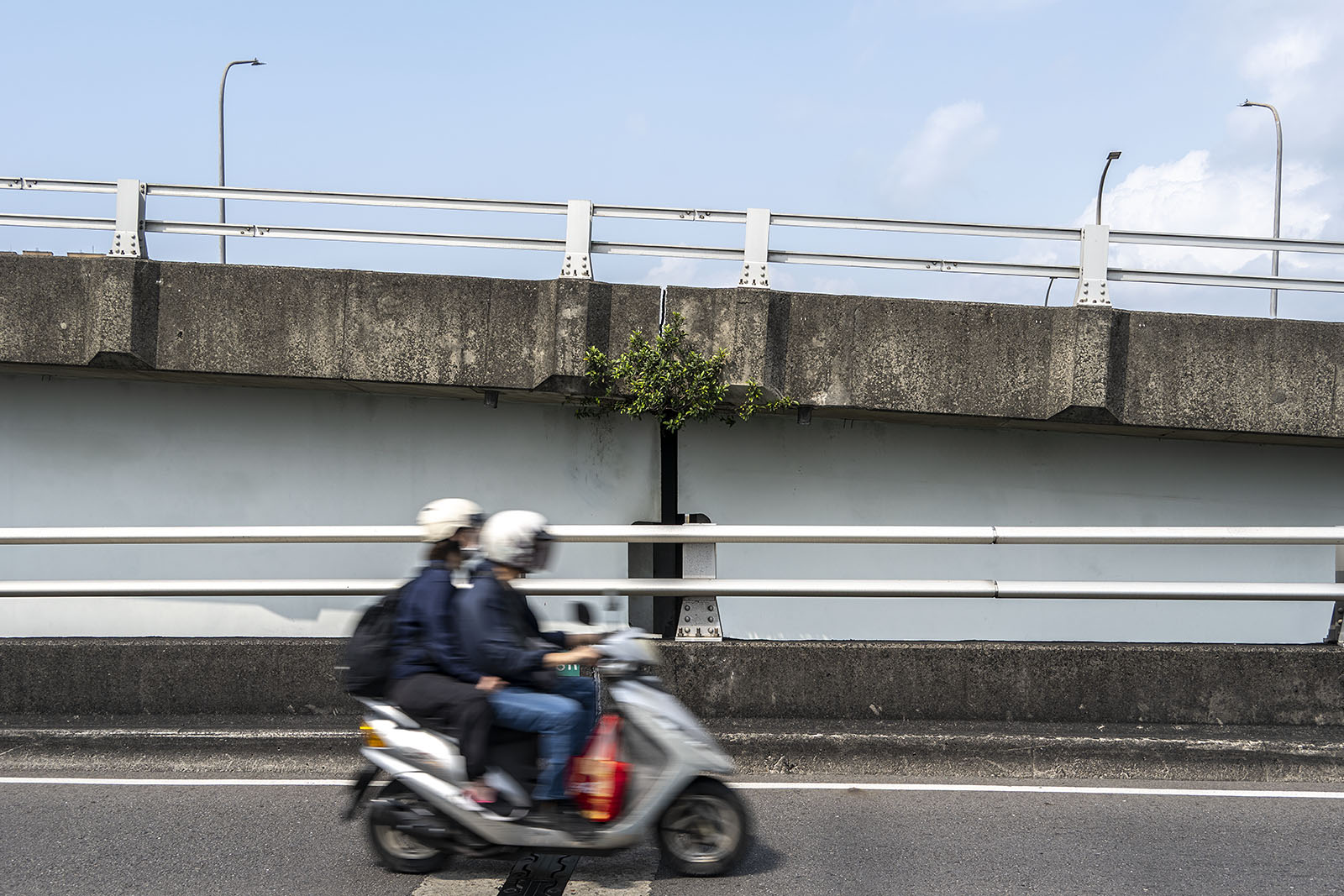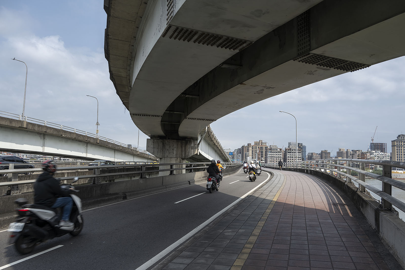 디화 스트릿의 골목을 걷고 있던 내게 멀리 계단이 하나 보였고 누군가 그 계단을 오르고 있었다. 계단의 위쪽으로는 아무 것도 보이질 않았다. 내게는 계단을 올라 사라진 사람이 이곳에도 길이 있다고 알려주는 인연 같았고, 그리하여 나는 그 인연을 따라가 보기로 했다. 그 계단을 오르자 그곳에 타이베이 대교가 있었다. 대교는 단수이강을 건넌다. 서울이라면 한강에 해당되는 강이다. 단수이강에 놓여 있는 많은 다리 중 하나가 타이베이 대교이다. 다리의 한쪽으로만 인도가 있었다. 나는 다리를 건넜다.