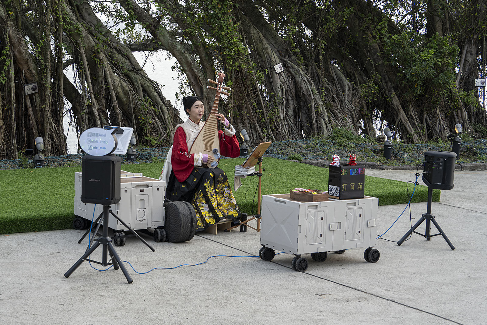 단수이의 공원엔 거리 공연이 많았다. 대개가 내 취향의 노래는 아니었다. 걷는 동안 자주 노랫소리를 들었다. 내 눈길을 사로 잡은 것은 비파 연주였다. 100위안짜리 지폐 한 장 꺼냈다.