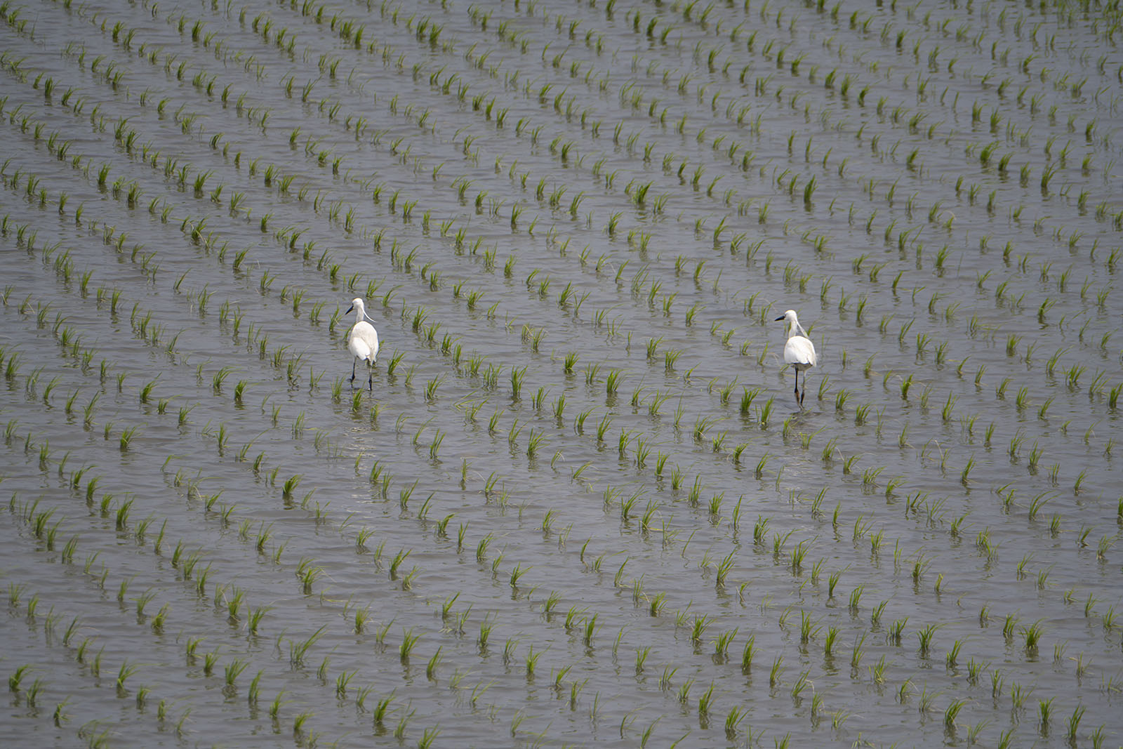 쇠백로(Little Egret) 두 마리가 논을 걸어다닌다. 둘이 다니면 데이트도 하면서 배도 채우는 이중의 즐거움이 있다. 대만에서 쇠백로는 흔한 새라고 한다. 지룽의 바닷가에서도 쇠백로를 보긴 했었다.