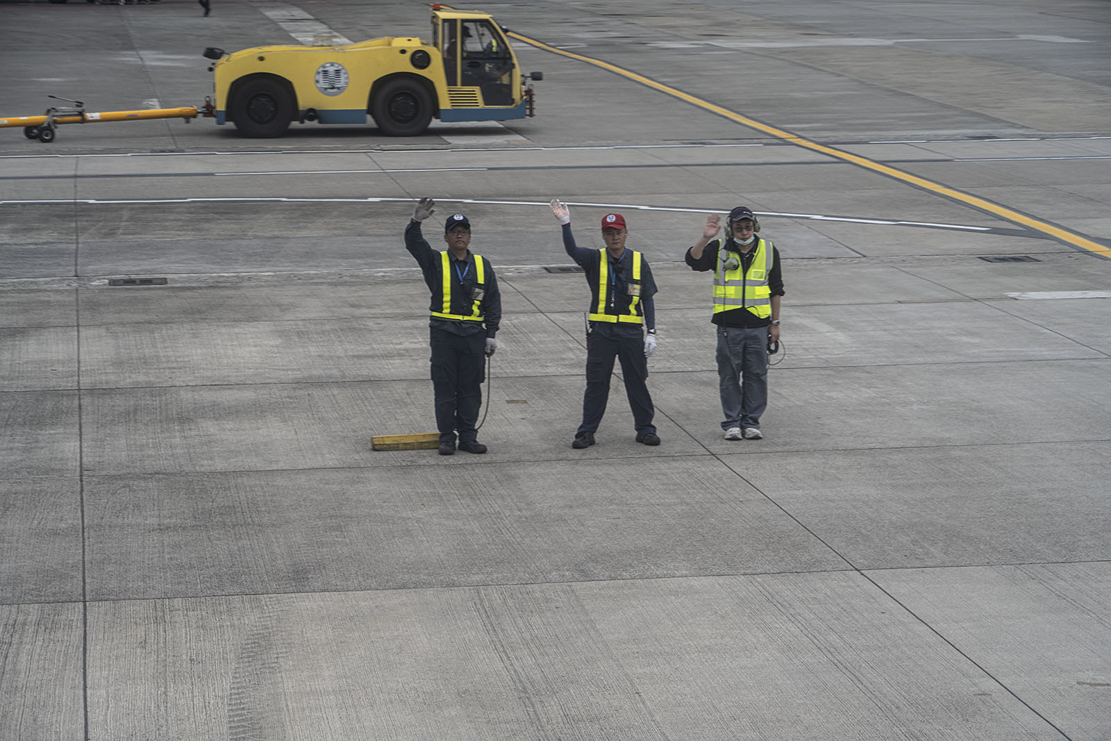 비행기가 활주로를 질주하여 이륙하기 직전, 사람들이 잘가라고 손흔들어 주었다.